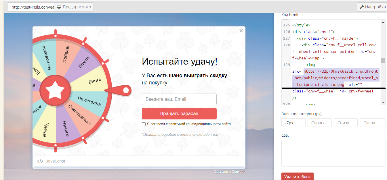 Вместо выделенной части подставить код вашей новой картинки и сохранить изменения.Количество секторов может быть любым, но имейте в виду, что по умолчанию вероятность выигрыша в виджете «Колесо фортуны» равна 1:2.