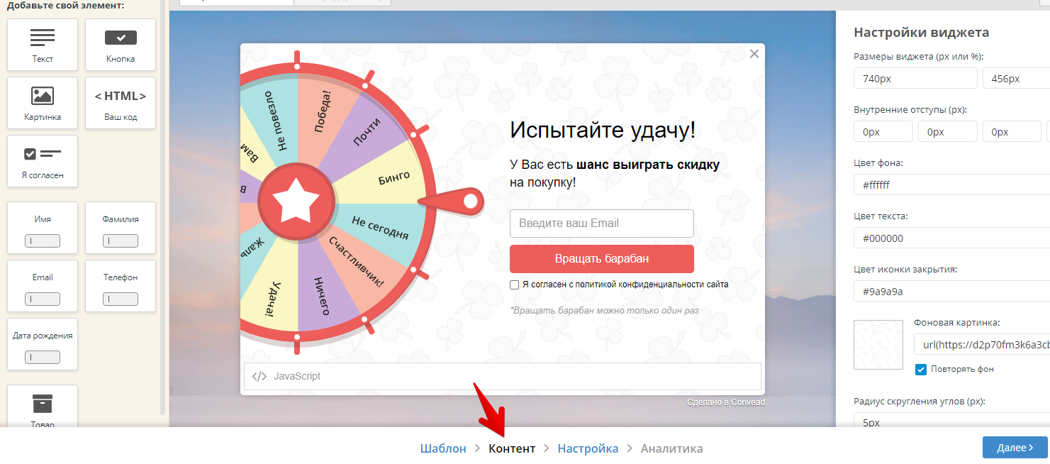 - Зайти в настройки виджета, перейти во вкладку Контент: