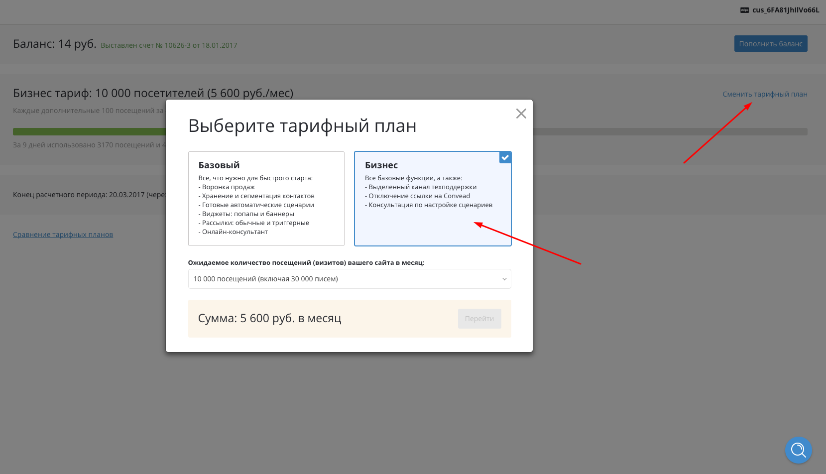 Чтобы убрать подпись «Convead» из виджетов и рассылок, необходимо перейти в раздел » Тарифный план» и там нажать на «Сменить тарифный план». После этого выбрать тип тарифного плана «Бизнес» (см скриншот ниже).